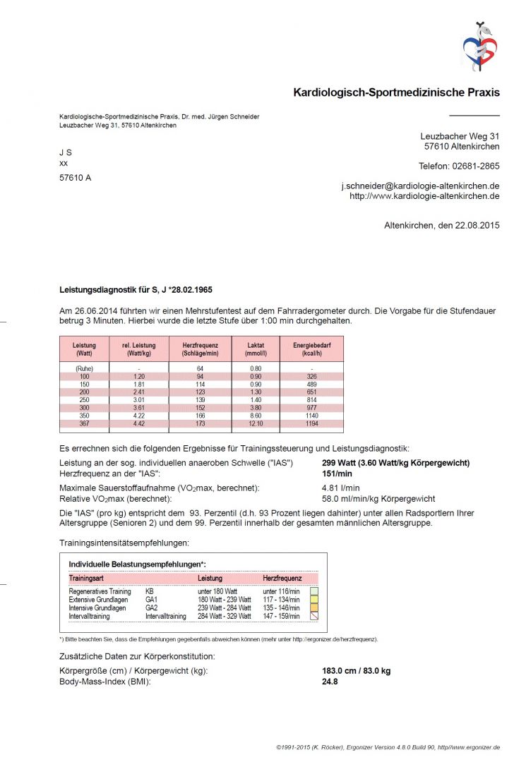 Bei der individuellen Beratung nach erfolgter Leistungsdiagnostik ist die jahrelange praktische Erfahrung von Dr. Schneider hilfreich. Seine große Leidenschaft ist der Radsport, wobei er sein umfangreiches Training streng nach den Ergebnissen der Leistungstests ausrichtet. Da seine Trainingsbikes sämtlich mit Powermetern unterschiedlicher Anbieter ausgestattet sind, kann er auch nützliche Hinweise zum „wattzahlgesteuerten“ Training geben.