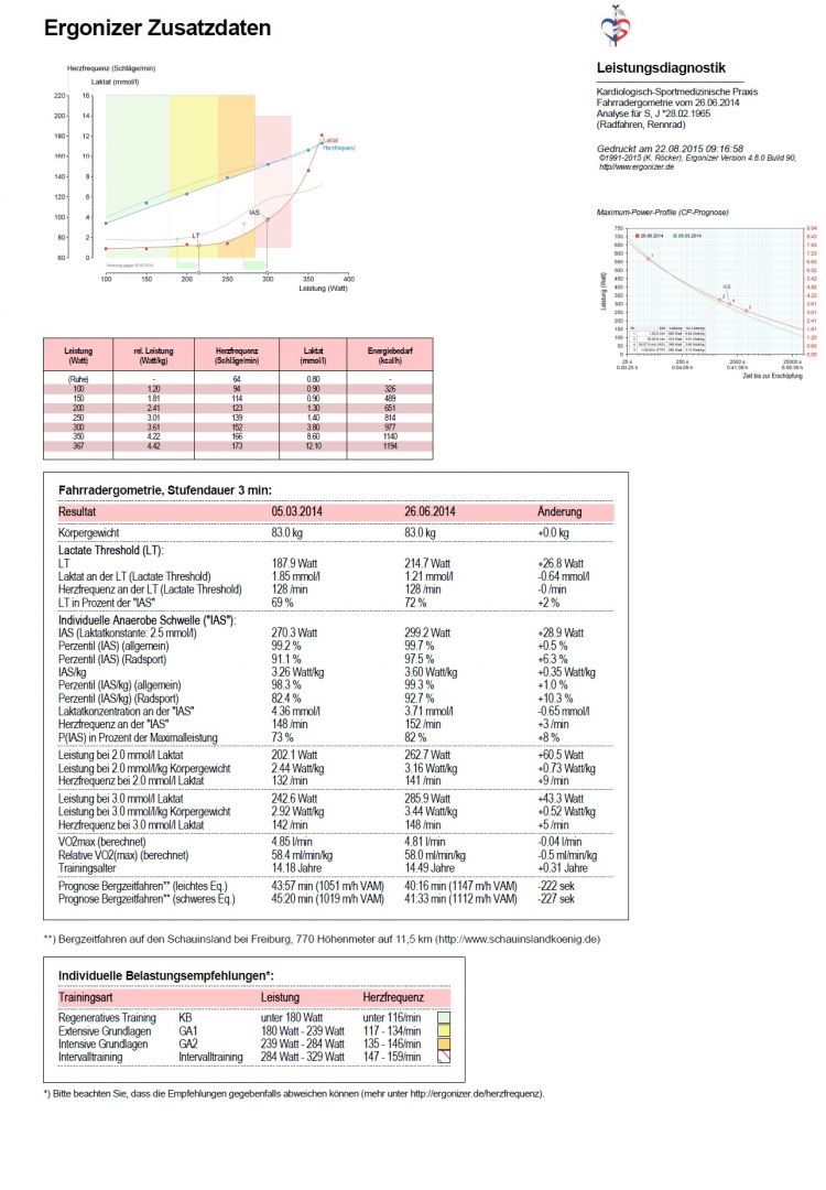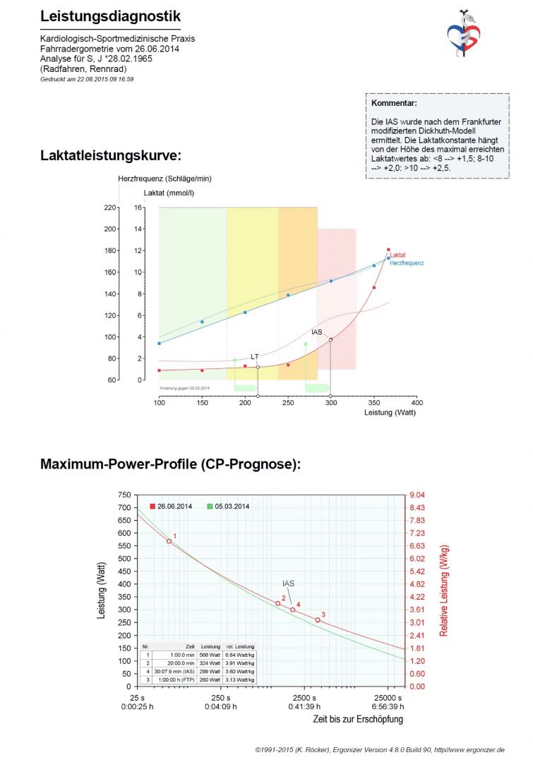 Beim Laktatstufentest wird von der Ergonizer-Software eine sogenannte Critical-Power-Analyse durchgeführt. Das Critical-Power-Konzept von Monod & Scherrer (1965) beschreibt die maximale Leistung in Abhängigkeit zur Belastungsdauer. Es kann somit für jede beliebige Belastungsdauer eine maximal mögliche Leistung angezeigt werden. Unter anderem wird die sogenannte FTP (functional threshold power = Funktionsleistungsschwelle) bestimmt. Diese gibt die Maximalleistung wieder, die über eine Stunde erbracht werden kann. Für ambitionierte Radsportler ist die FTP von besonderer Bedeutung, da sie benötigt wird bei der Verwendung von Powermetern (am Fahrrad installierte Leistungsmesser), die heute nicht nur im professionellen Radsport das Training und insbesondere das Verhalten im Wettkampf wesentlich steuern. Die früher zumeist allein eingesetzte Herzfrequenz reagiert bei bestimmten Trainingsformen (Intervalltraining: HIIT) als biologischer Parameter zu träge und ist stärker von situativen Bedingungen beeinflusst.