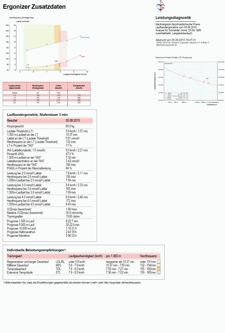 Darüber hinaus kann nun bei Läufern eine sportartspezische Leistungsdiagnostik in Form der Laufband-Spiroergometrie durchgeführt werden. Es wird somit die Bestimmung der exakten Trainigsherzfrequenz für Langstreckenläufer möglich. Eine solche Untersuchung ist insbesondere in der Vorbereitung auf einen erfolgreichen Marathon oder Halbmarathon zu empfehlen.