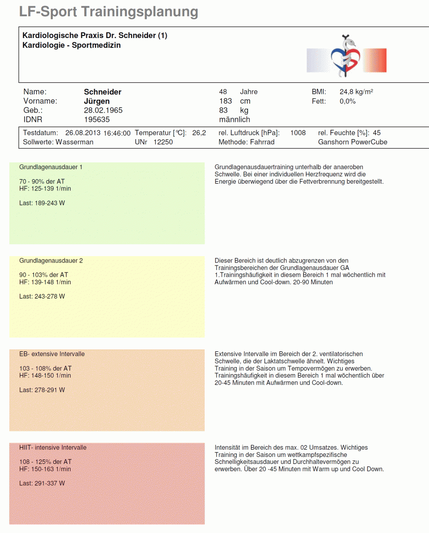 In unserer Praxis steht eine spezielle Software sowohl für die Spiroergometrie (LF Sport) als auch für den Laktatschwellentest (Ergonizer) zu Verfügung. Bei der Spiroergometrie als Einzeluntersuchung kommt ein Rampenprotokoll zur Anwendung, während beim Laktatstufentest oder der Kombination beider Testmethoden mittels Stufenprotokoll über je 3 Minuten belastet wird.