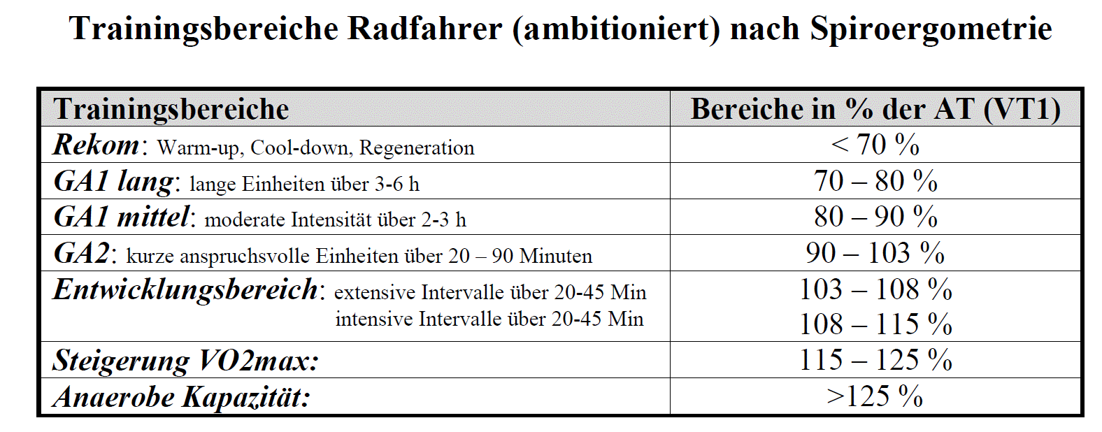 Bei Läufern werden die individuellen Leistungsdaten auf unserem Laufband (s.o) ermittelt. Die hieraus resultierenden Trainingsbereiche sind hier dargestellt: